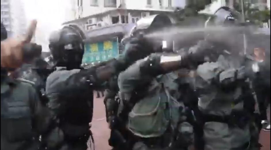 防暴警察在九龍黃埔向路過市民,在無任何暴力行為下,噴胡椒噴霧並粗暴驅趕市民離開。