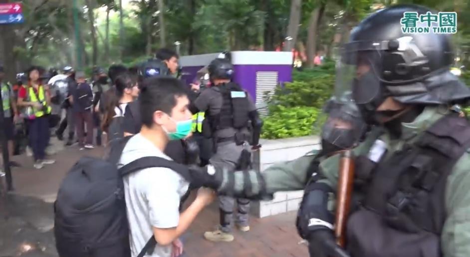 A guy without any gear but just a facemask walking along the Tsimshatsui East area, Kowloon, was suddenly grasped by a riot police who tore off the mask and questioned the man. Meanwhile, other riot p ...