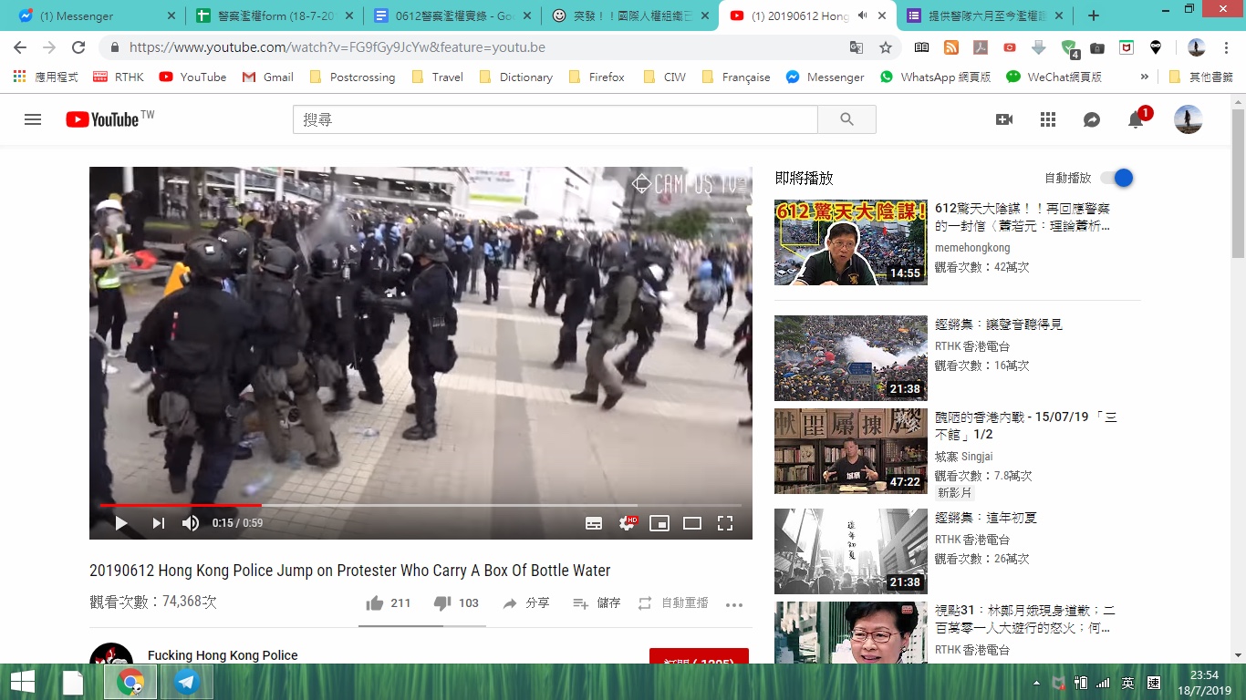 影片中一名示威人士被八名防暴警察圍捕,其中一名警員從示威人士背後向其噴射胡椒噴霧及朝其上半身揮動警棍(影片00:06-00:07),其餘警員則在圍捕期間分別用警棍襲擊該示威人士、拳打腳踢。在被圍捕前,該示威人士並無威脅在場任何人士。這涉嫌違反《公安條例》第17條中,表明警務人員在阻止公眾聚集舉行,或停止或解散公眾聚集時,只可以使用「合理所需的武力」。而過份武力對待被拘捕人士,在沒有合理辨解下,亦可 ...