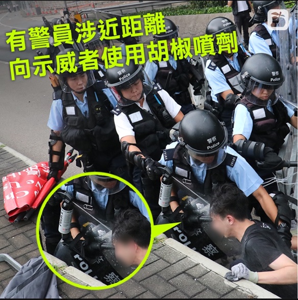 警員捕捉示威者回警察防線,然後分別一名警員先扣著示威者頭部,另一名警員則不停用棍打示威者背部,即使示威者倒地,施暴仍沒有停止。其後警員用警棍頂著示威者頭部,而後面的警員則瞄準示威者頭部,短距離噴射胡椒噴霧。這涉嫌違反《公安條例》第17條中,表明警務人員在阻止公眾聚集舉行,或停止或解散公眾聚集時,只可以使用「合理所需的武力」。而過份武力對待被拘捕人士,在沒有合理辨解下,亦可能違反《侵害人身罪條例》各 ...