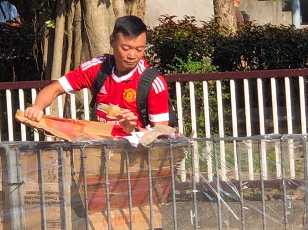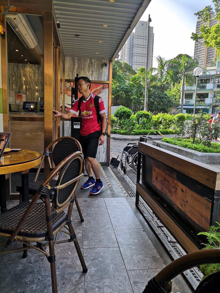 佢係9月7日星期六08:25,身穿曼聯球衣,破壞大圍顯徑連儂牆,破壞之後進入冬菇亭榮發茶餐廳。