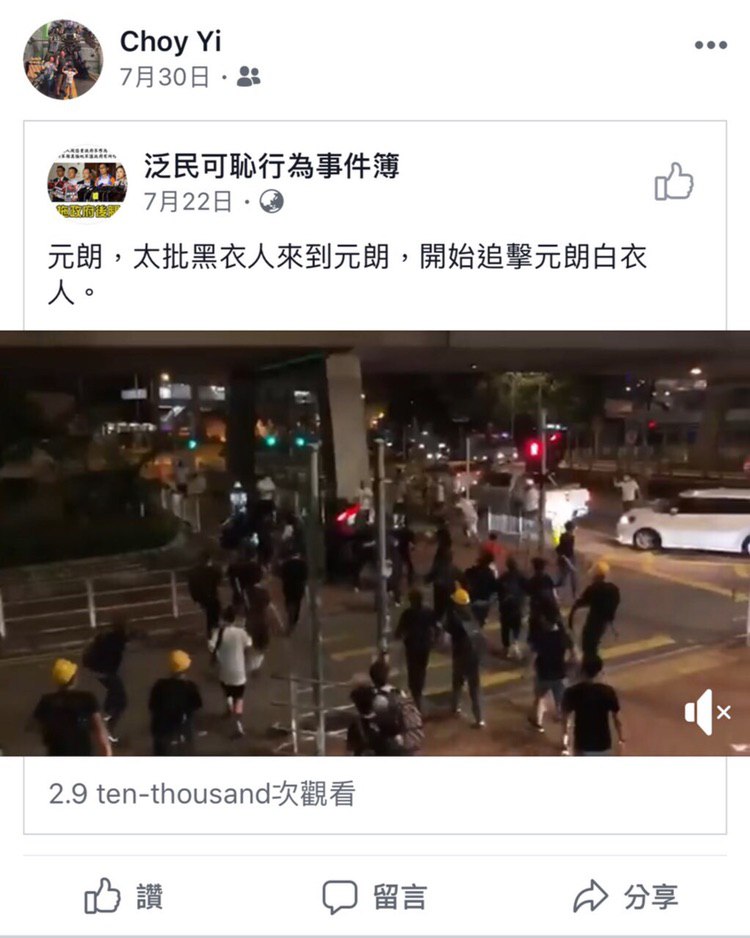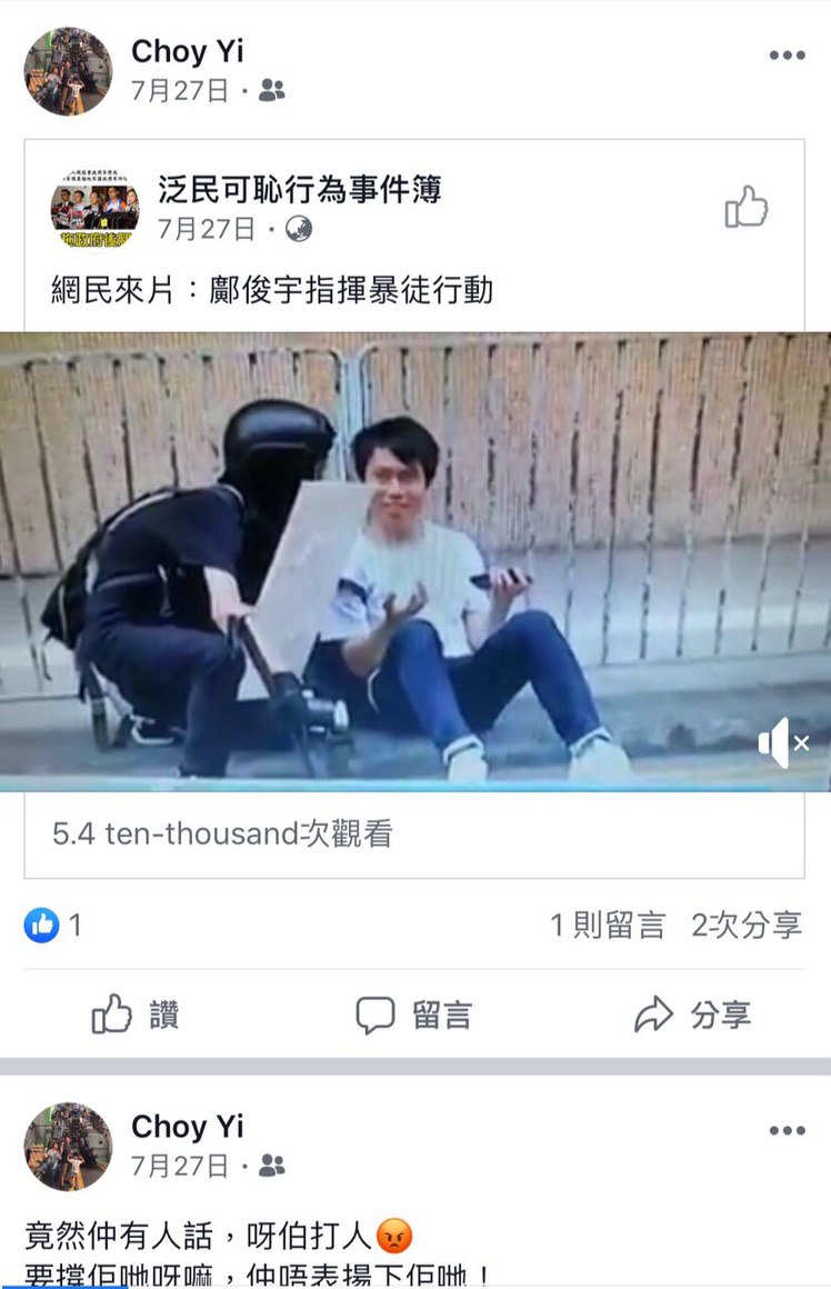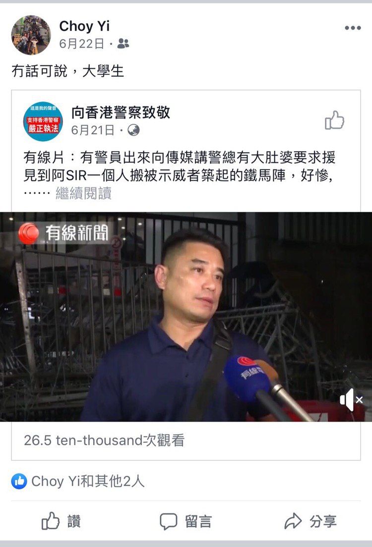 佢多次係Facebook發表撐警言論,指控泛民主派議員指揮示威者。