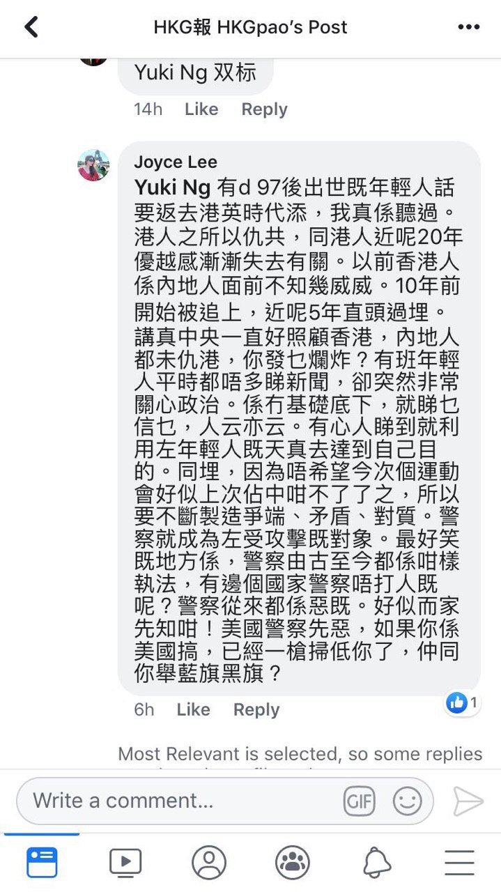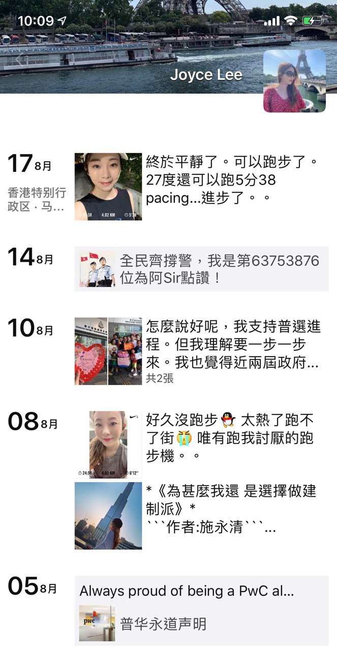 李曉嵐係一名撐警藍絲,支持香港警察濫權濫捕並為此歡呼。