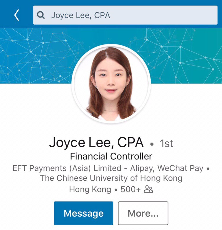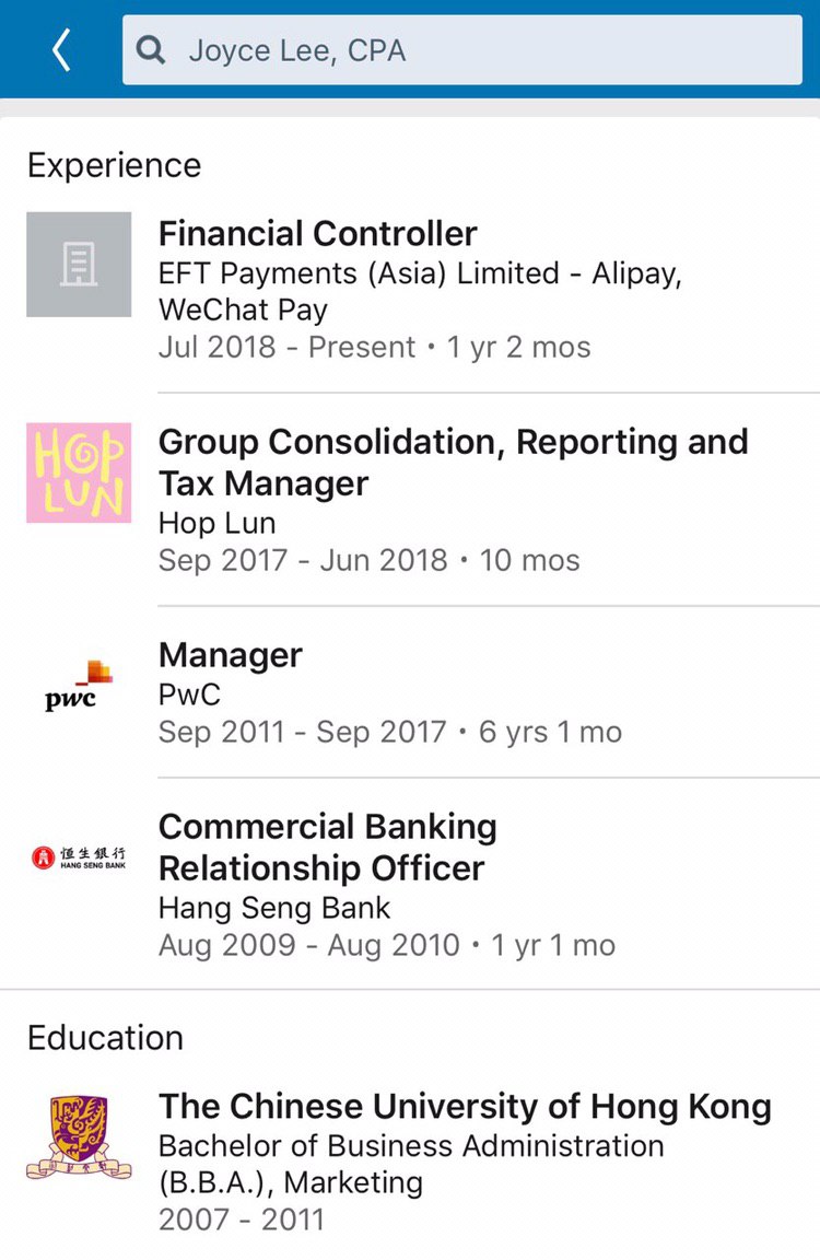 | 職業 | EFT PAYMENTS (ASIA) LIMITED 易付達(亞洲) 有限公司財務總監(負責Alipay, Wechat pay) |