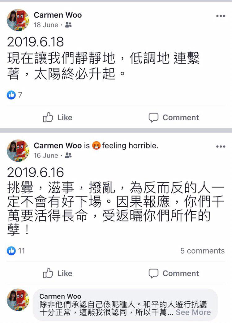佢曾經係Facebook發表支持香港警察嘅言論。