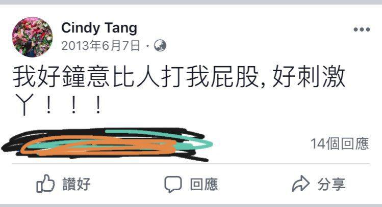 據熟悉佢嘅人指出,佢係中學拍緊拖嘅時候一次過有幾個男朋友,會經常叫佢男朋友買昂貴禮物畀佢,性欲亦非常強,曾經試過係無戴安全套情況下,同2個男人性交。佢亦曾經係Facebook公開談及自己嘅性癖好,見下圖: