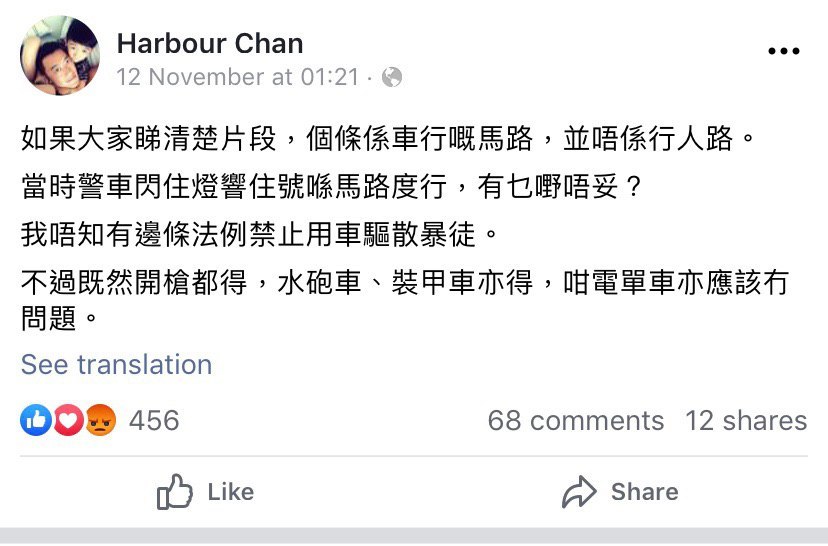 佢曾經係Facebook 發表支持警察向開車撞向人群嘅貼文:
