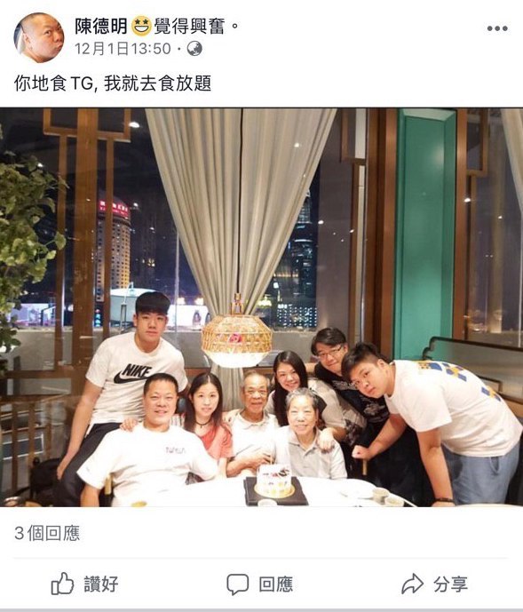 陳德明係一名撐警藍絲,支持香港警察濫權濫捕並為此歡呼。