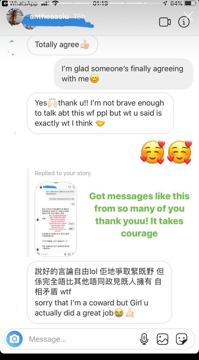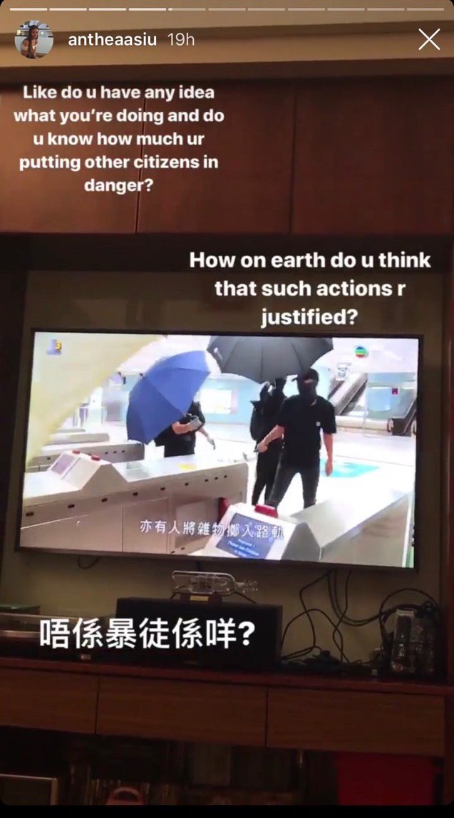 佢曾經係Instagram指控示威者係暴徒,然後公開指罵唔同意佢嘅人,指控佢地冇俾自由佢發聲,縱使無人禁止佢發言。