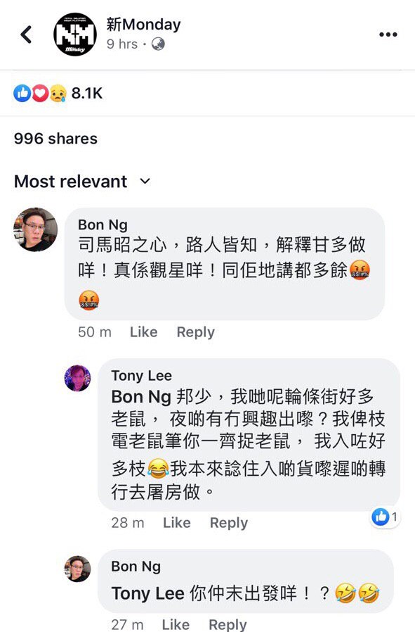 佢多次係Facebook支持黑警執法,經常喺撐警專頁內留言,影射示威者比警察打係抵死。