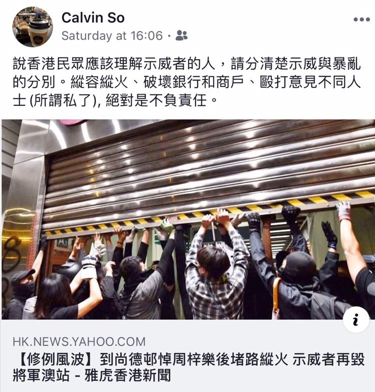 Calvin So係一名撐警藍絲,支持香港警察濫權濫捕並為此歡呼。