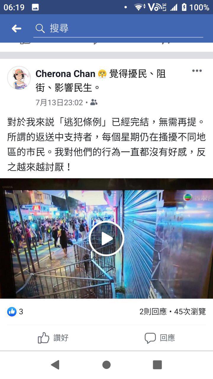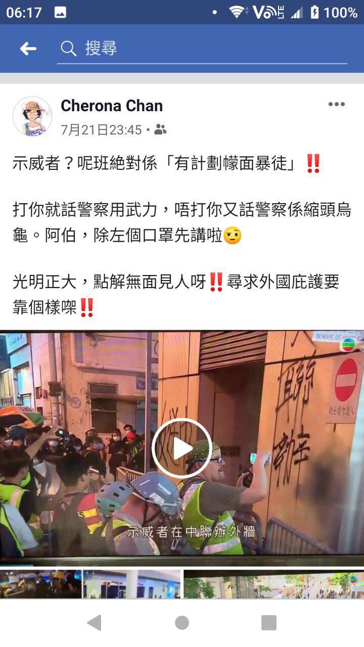 Cherona Chan係一名親中派嘅人。佢係Facebook發表親中撐警言論。
