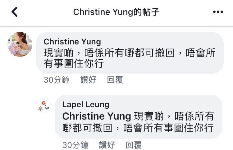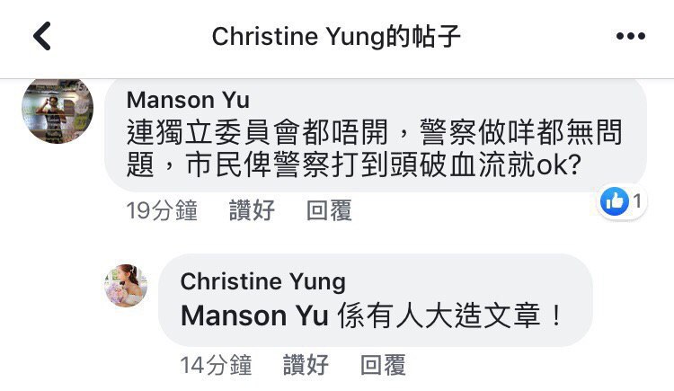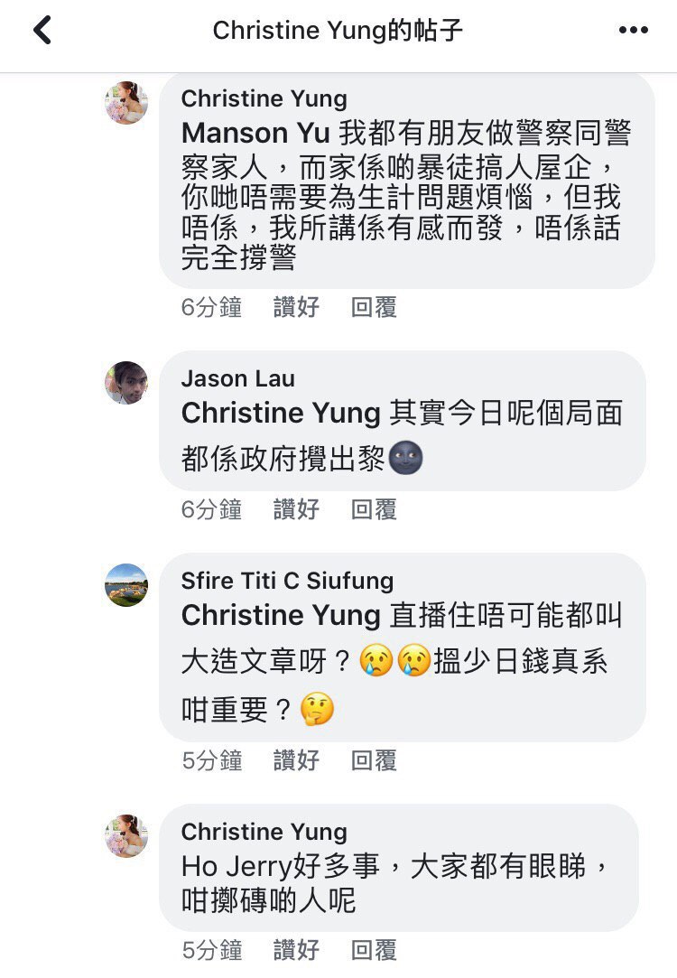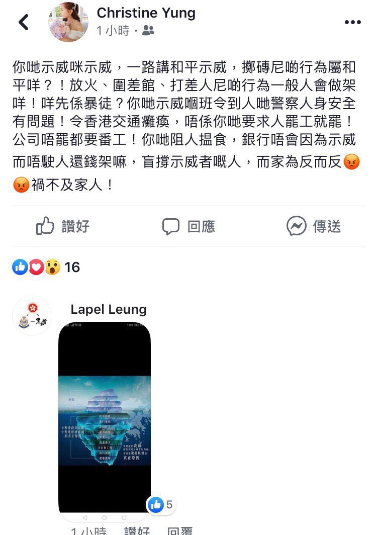 Christine Yung是一名「撐警藍絲」,支持香港警察虐待示威者。