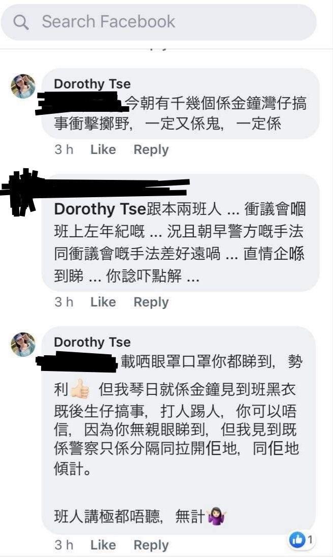 佢曾經多次係Facebook發表支持親中撐警嘅言論,詳見下列圖片。