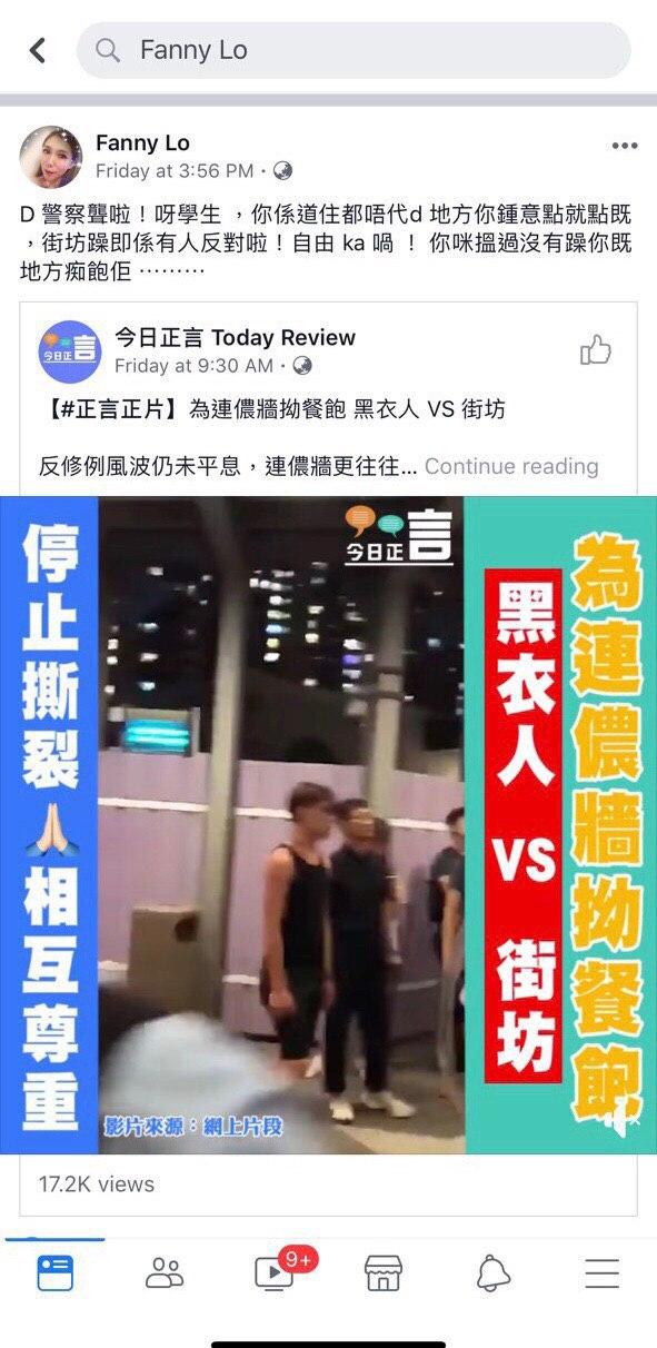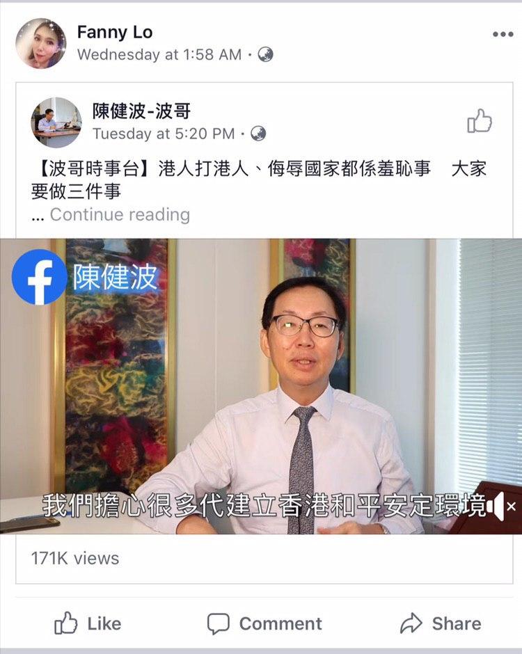 佢曾經多次係Facebook發表支持親中撐警嘅言論,詳見下列圖片。