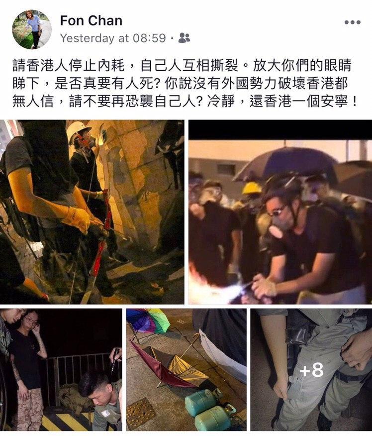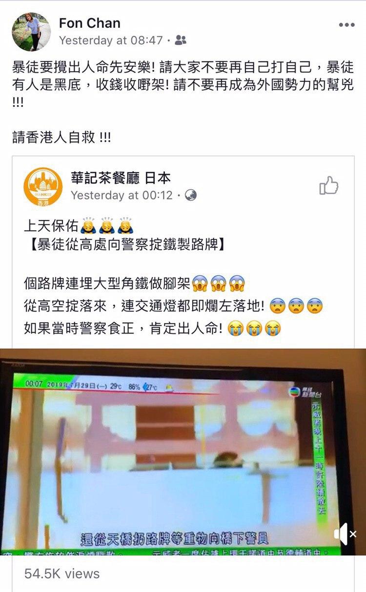 佢曾經多次係Facebook發表支持親中撐警嘅言論,詳見下列圖片。