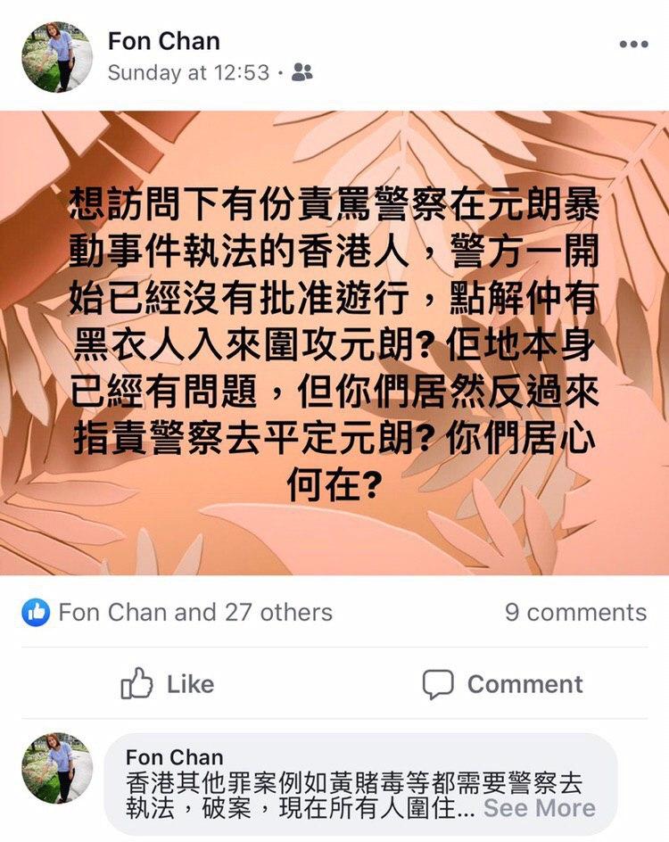 Fonnie Chan係一名撐警藍絲,支持香港警察虐待示威者。