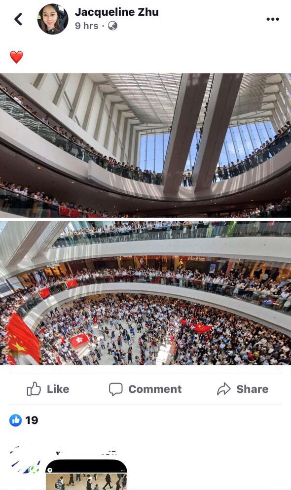 佢曾經有份係2019年9月12日,參與中環IFC愛中國活動,唱中國國歌,並係Facebook分享活動圖片及親中消息,見下圖: