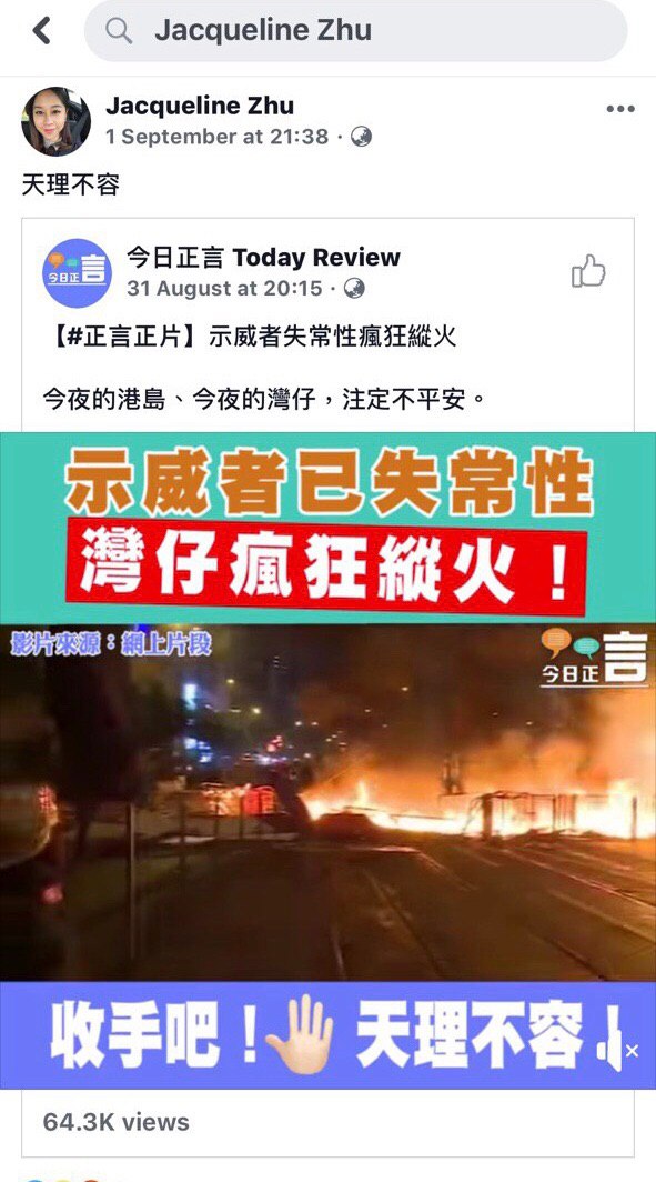 Jacqueline Zhu係一名撐警藍絲,支持香港警察濫權濫捕並為此歡呼。