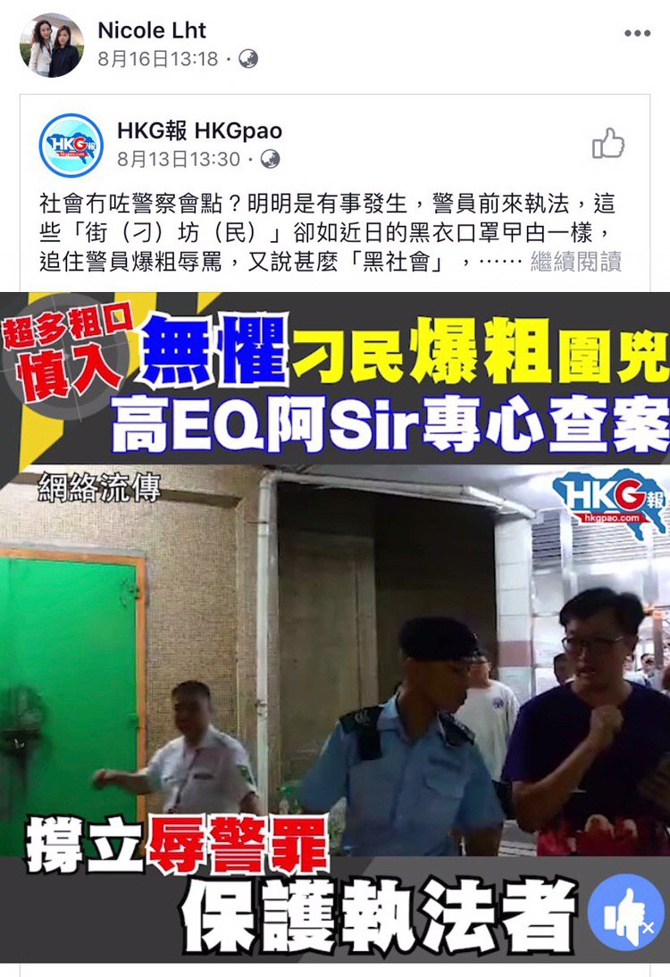 Winky Leung係一名撐警藍絲,支持香港警察使用暴力對待市民。佢多次係Facebook辱罵女示威者係慰安婦,發放假資訊指示威者獲招待性服務,又日日鬧示威者係曱甴暴徒,以及協助親中人士發放假新聞。據親近人士指,佢係2019年6月後,一邊支持逃犯條例修訂,一邊計劃移民外國。佢所經營嘅公司本身都係黑店,網上有無數顧客分享中伏經歷同點樣被呃錢。公司係有客投訴個陣就話自己只係營業經理,無權處理,跟住一 ...