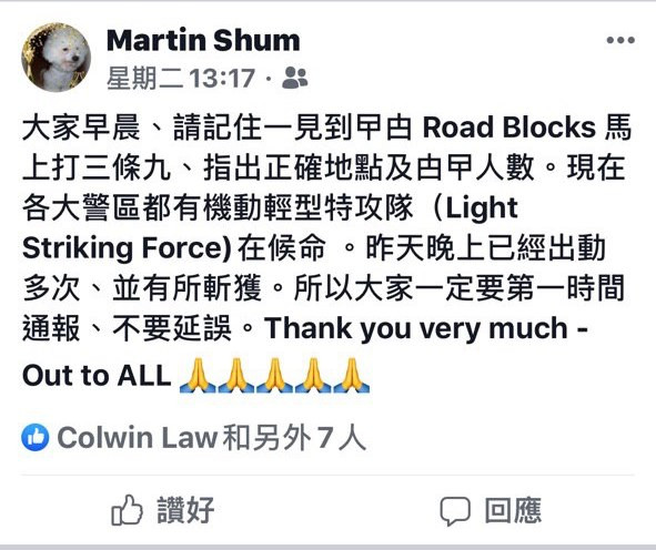 Martin Shum係支持香港警察嘅一份子,佢曾經係Facebook上叫示威者做「曱甴」,並鼓勵其他人報警,見下圖: