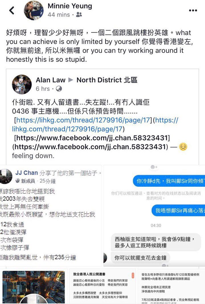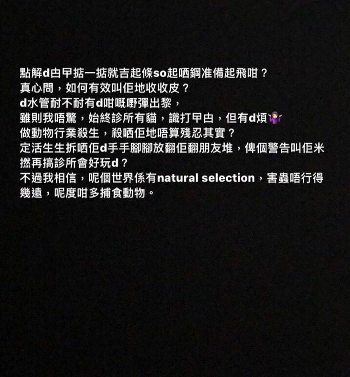 佢曾經係Instagram鬧示威者係「曱甴」,威嚇要殺死所有示威者。佢又曾經話義士了結生命抵死,但佢本人多次扮自殺搞到成班朋友出去救佢;又指女義士比人輪姦冇野,但又聲稱自己比人姦過有情緒病。