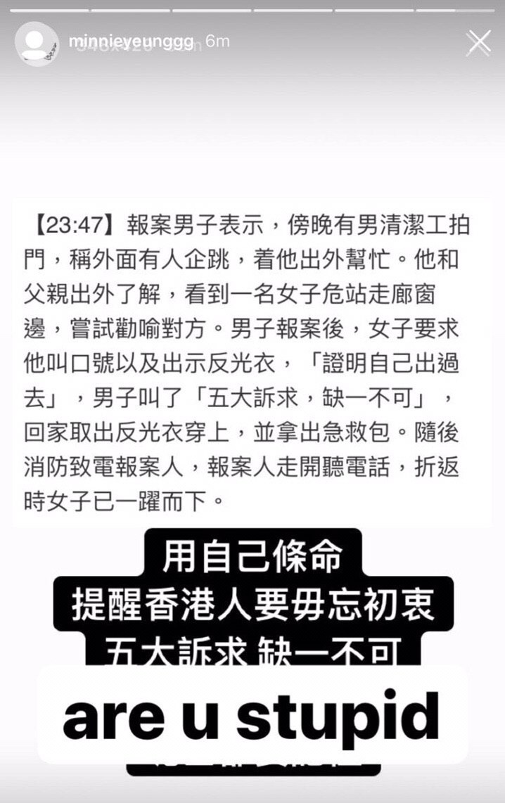 Minnie Yeung係一名撐警藍絲,支持香港警察濫權濫捕並為此歡呼。