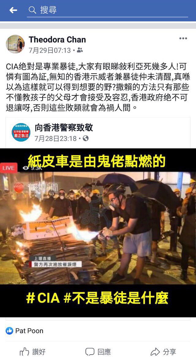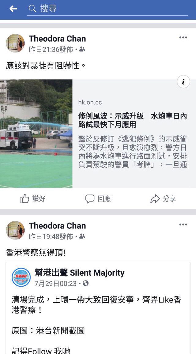 Theodora Chan是一名「撐警藍絲」,支持香港警察使用暴力對待市民。
