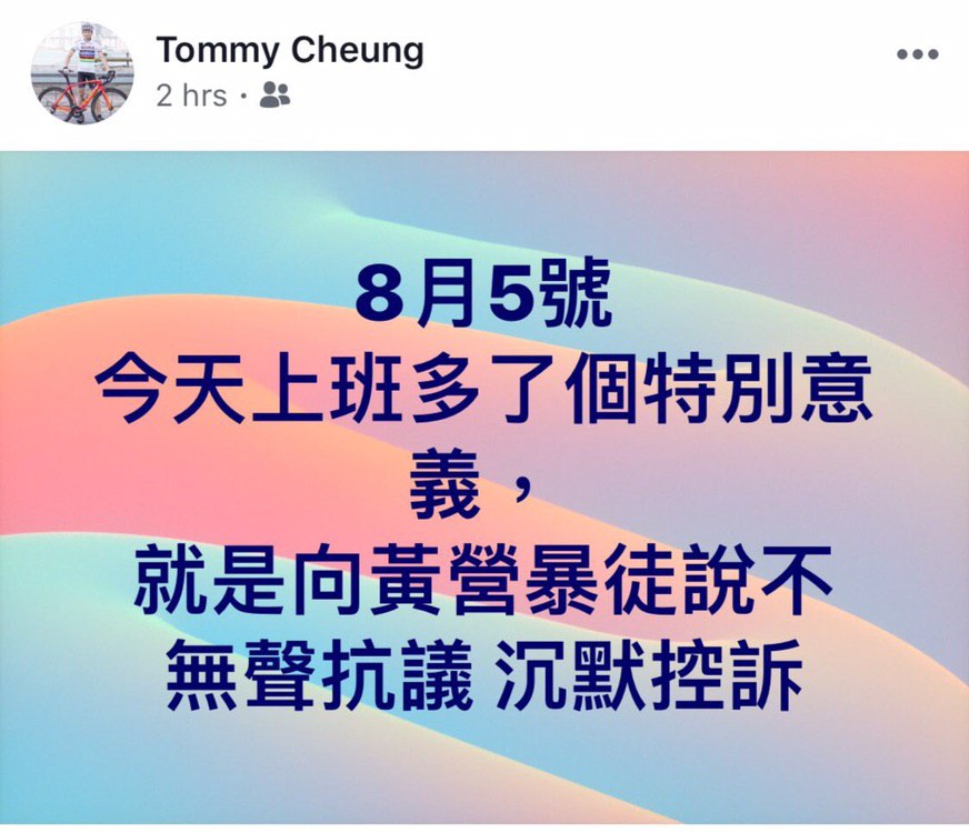 Tommy Cheung是一名「撐警藍絲」,支持香港警察虐待示威者。