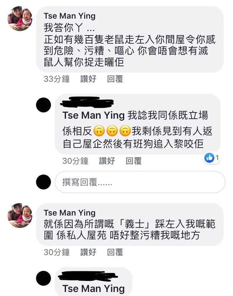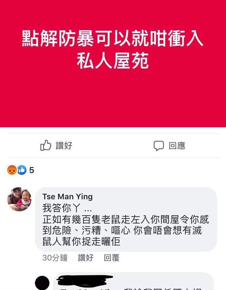 她曾經在Facebook發表支持香港警察的言論,例如大鬧馬鞍山警署示威者為「老鼠」。