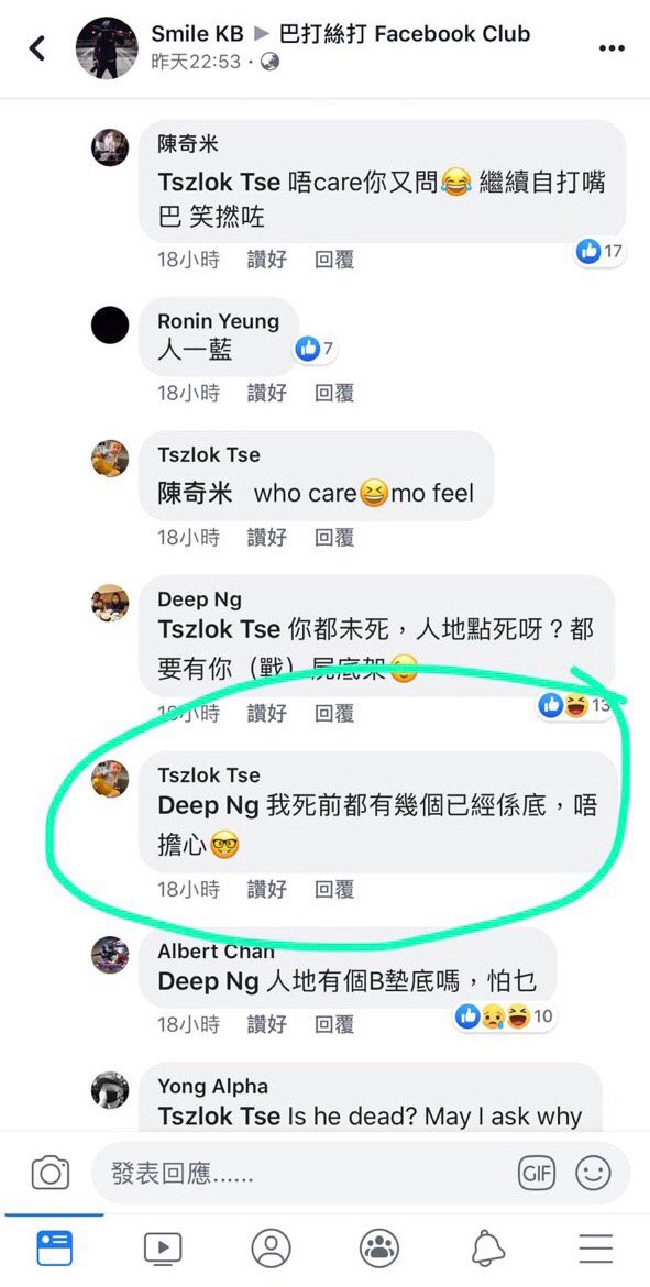 佢曾經係Facebook公然聲稱已經去世嘅示威者係「墊佢屍底」。