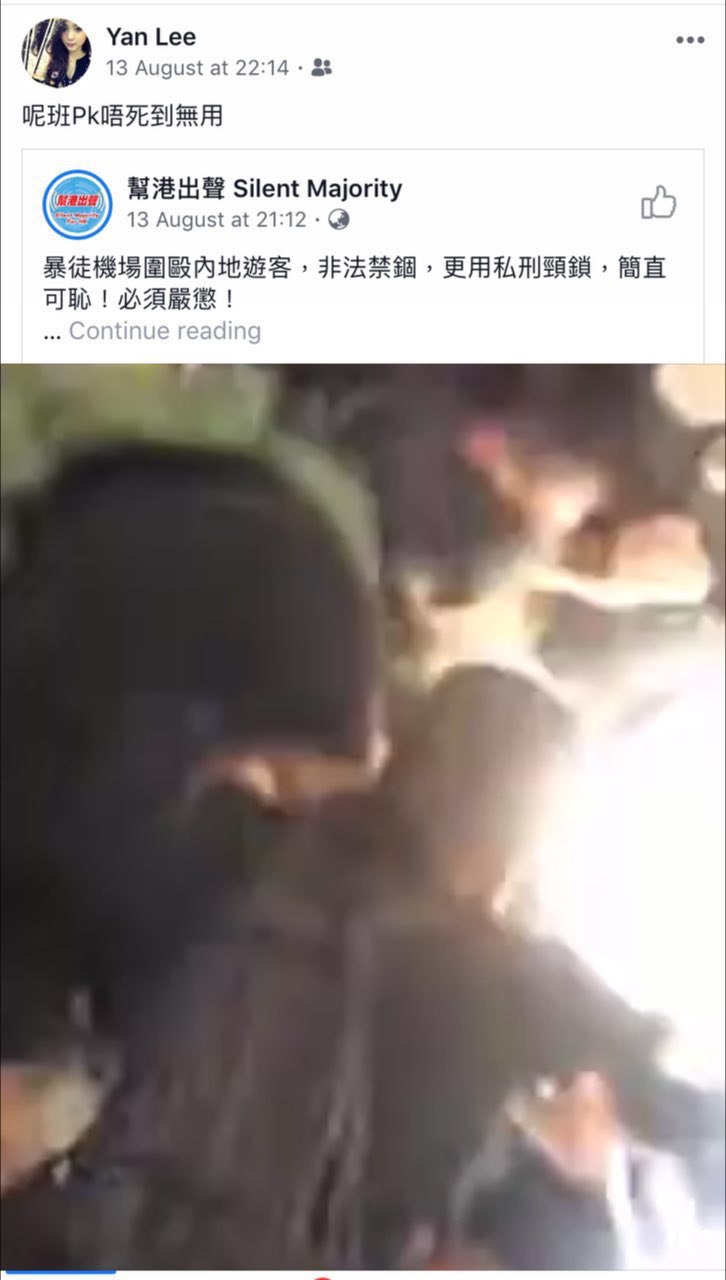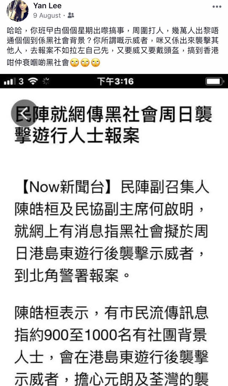 Yan Lee係一名撐警藍絲,支持香港警察濫權濫捕並為此歡呼。
