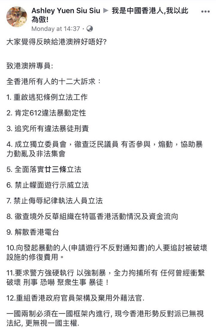 Yuen Siu Siu Ashley 係一名撐警藍絲,支持香港警察虐待示威者。