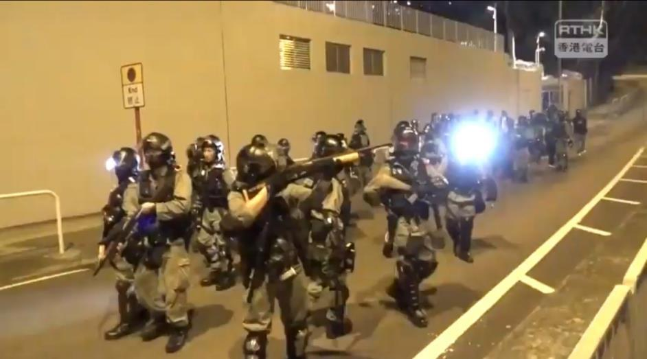 In Ma On Shan, New Territories, a large group of riot police came out from police station claiming to disperse the demonstrators on street. Their guns and strong flashlights pointed to the nearby residents and buildings. And some of the police yelled and shouted to the nearby residents.
