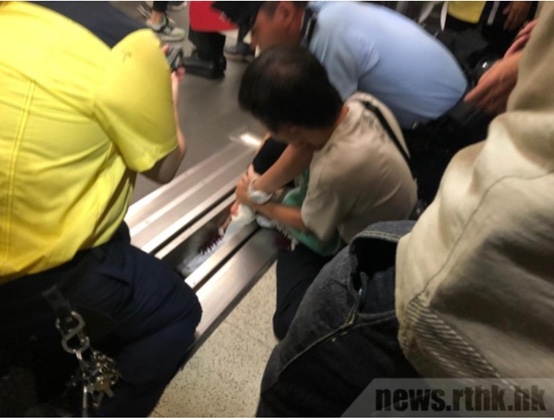 一名男子的腳夾在列車與月台之間的縫隙,其後警員強行以暴力將其男子的腳扯出。這涉嫌違反《公安條例》第17條中,表明警務人員在阻止公眾聚集舉行,或停止或解散公眾聚集時,只可以使用「合理所需的武力」。而過份武力對待被拘捕人士,在沒有合理辨解下,亦可能違反《侵害人身罪條例》各條。