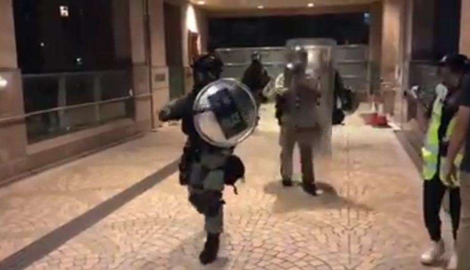 片中可見,一名佩帶證件的市民對在場警員表達他對警方涉嫌防礙記者採訪的不滿,及後有一名警員上前推開該名市民並大聲呼喝「行開!」,涉嫌不禮貌對待市民。