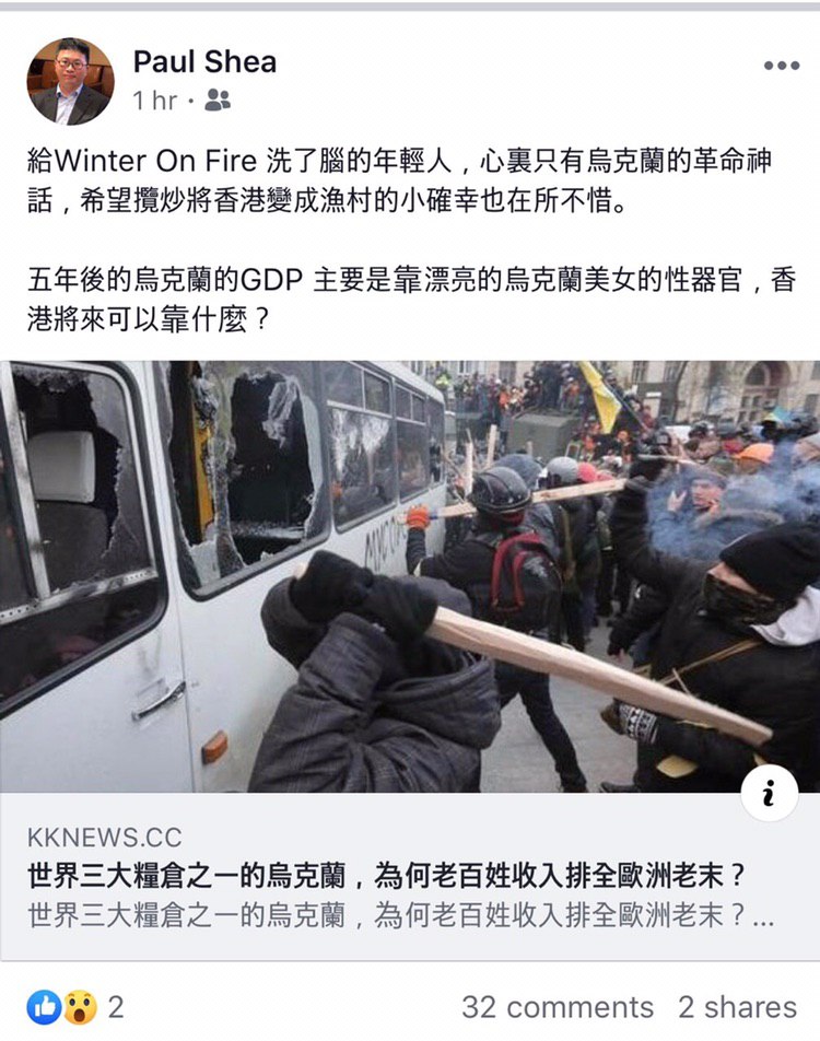 他經常係Facebook批評示威者。最新一篇文章更侮辱女性,說烏克蘭是靠女人性器官賺錢的國家。佢又經常批評香港黃絲年青人是豬,沒有獨立思考,並且有財團支持,兼讚揚親中撐警人士有獨立思考,最有頭腦,看得最透徹。