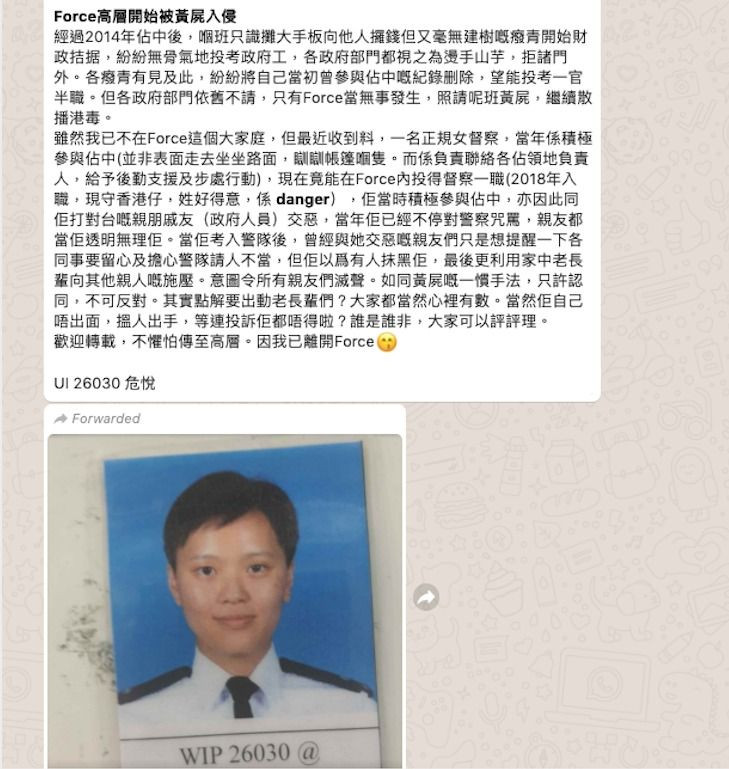 據一手資料指出,危悅曾經係2014年積極參加雨傘革命,及後聲稱要考入警隊從內部改變,而今已與一般暴警無異。以下係警隊內部嘅WhatsApp對話資料: