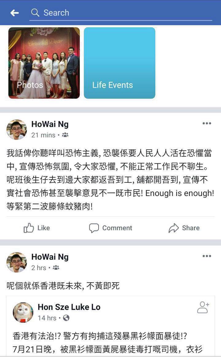 佢曾經係Facebook發表支持元朗恐佈襲擊嘅言論。