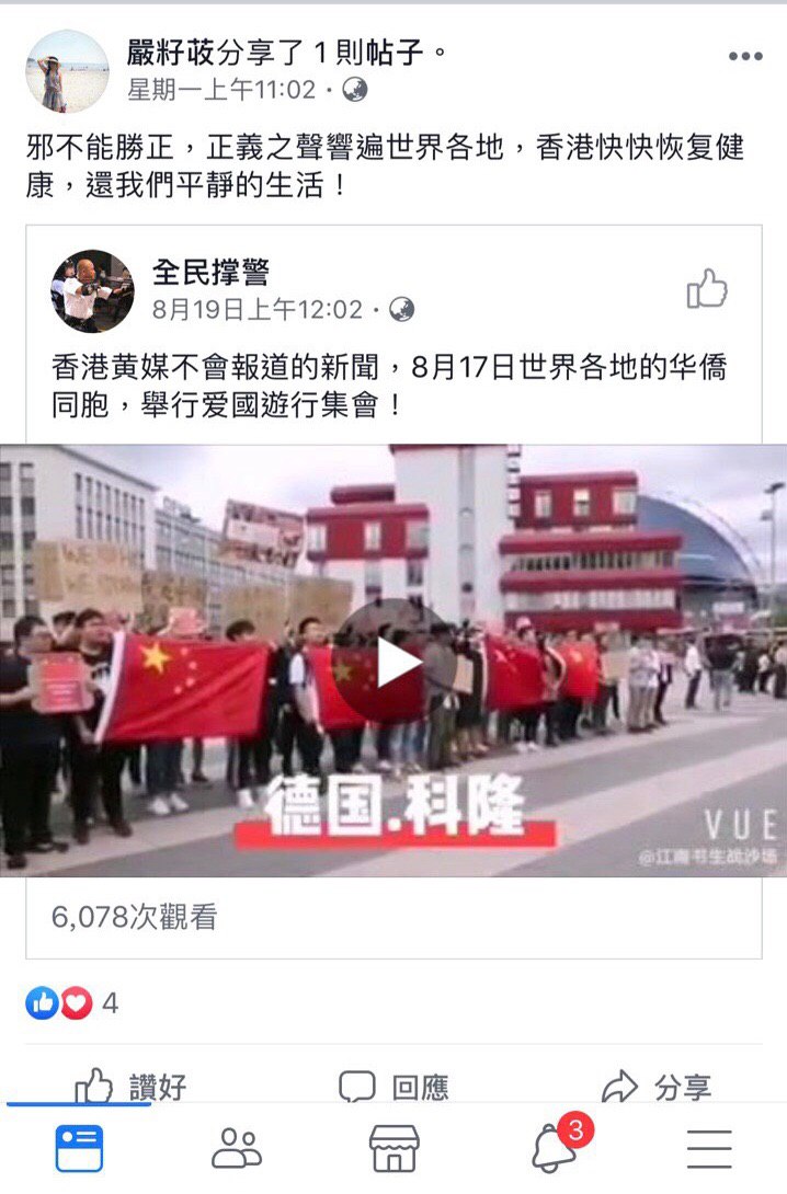 嚴婥僑係一名撐警藍絲,支持香港警察虐待示威者。
