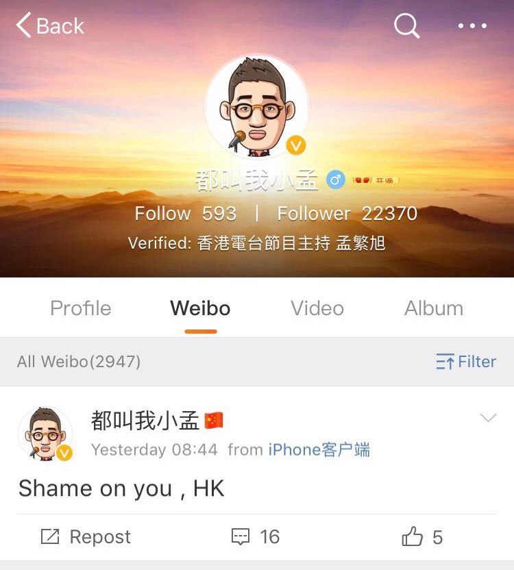 佢電台節目入面訪問過香港乒乓球手蘇慧音,之後喺微博話因為佢係黃絲以此為恥,詳見下圖: