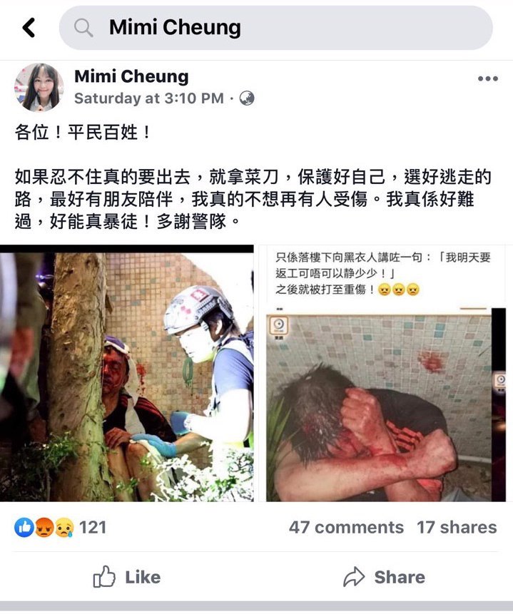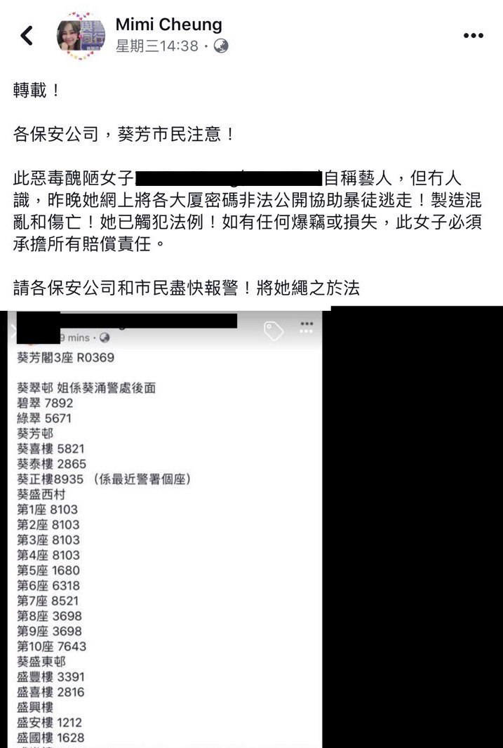 她曾經在Facebook發表支持親中及香港警察的言論,又鼓勵親中派成員用武器襲擊香港市民。