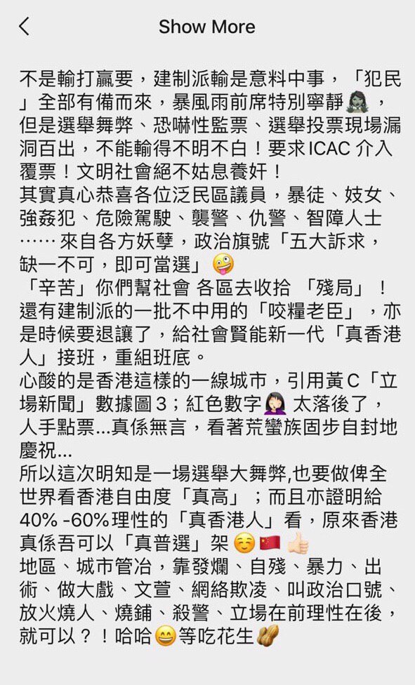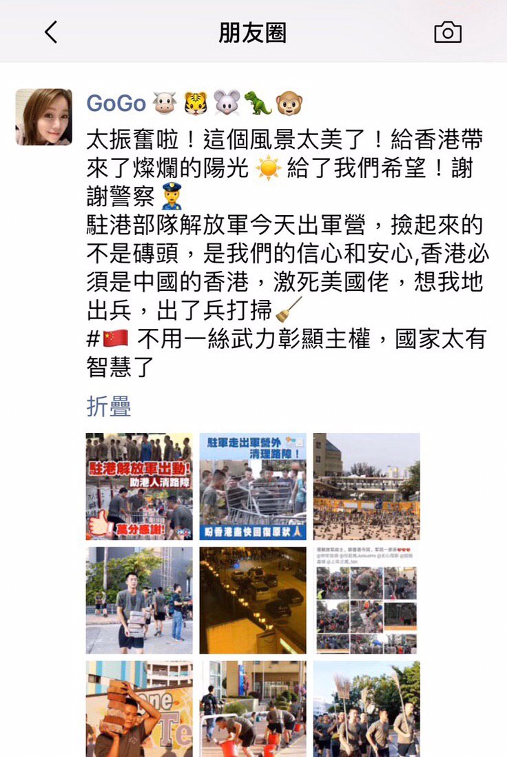 佢曾經係WeChat發表支持中國共產黨及獨裁政權嘅言論,詳見下圖:
