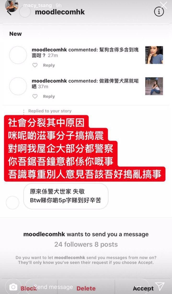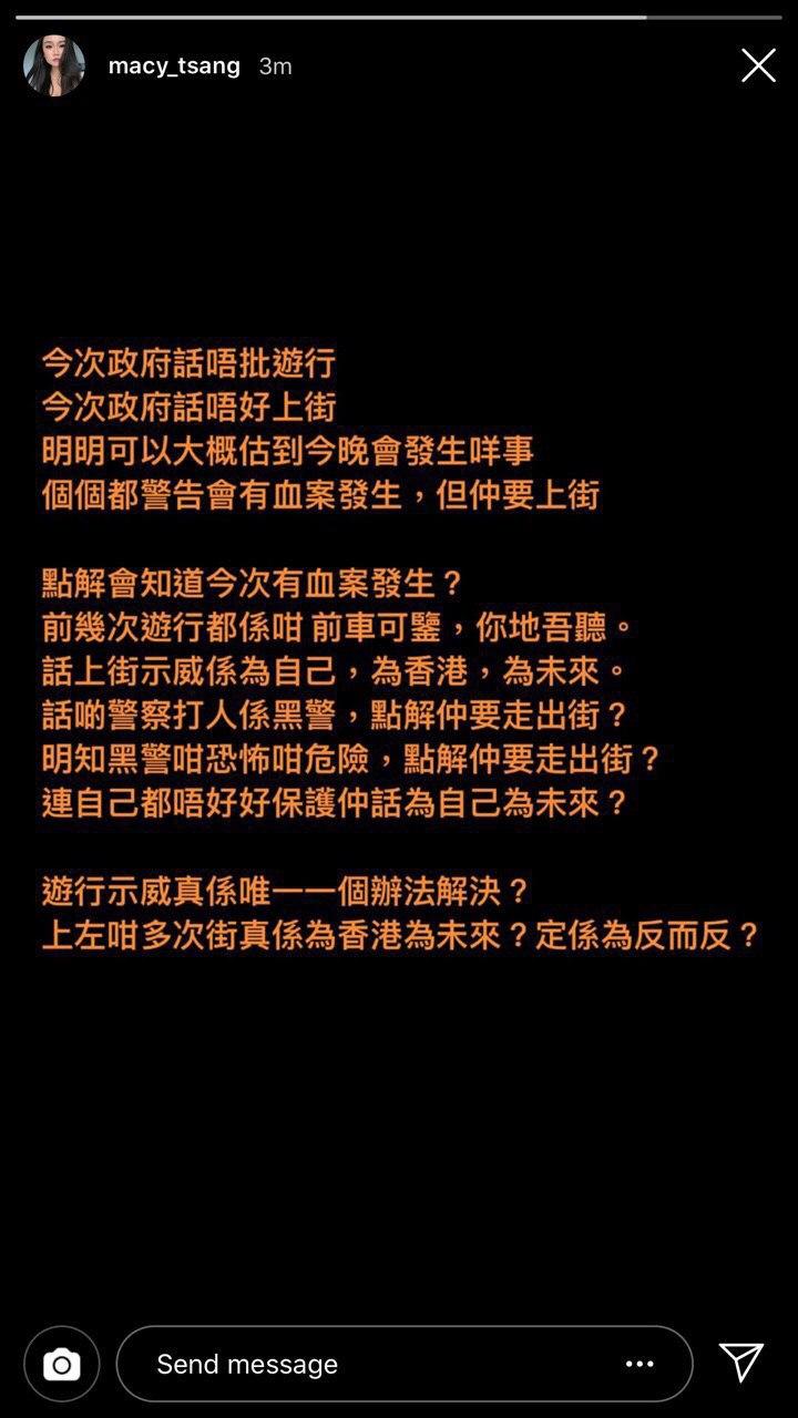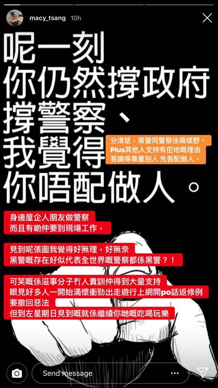 佢曾經多次係Instagram發表支持親中撐警嘅言論,詳見下列圖片。