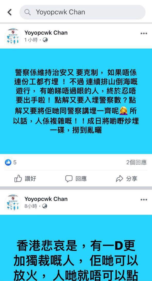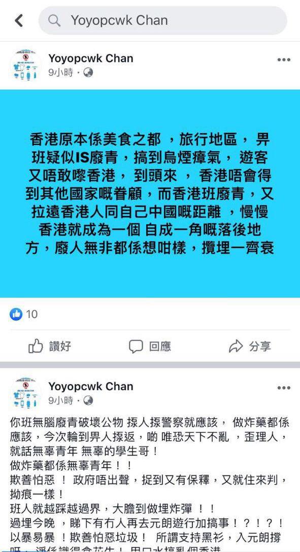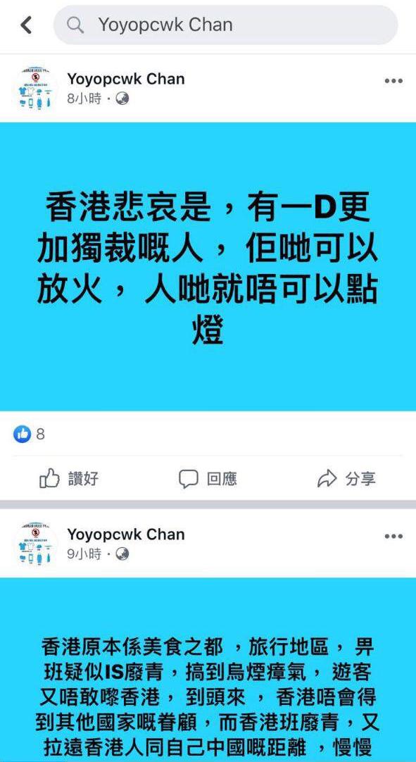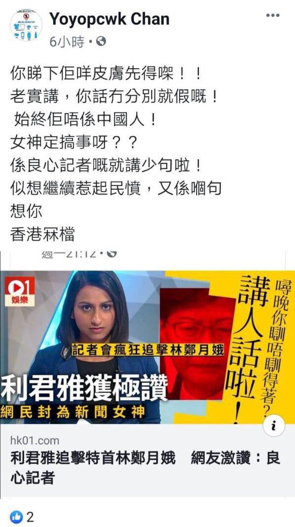 佢係Facebook不停發表親中、支持香港警察及指示威者為ISIS嘅言論,又種族歧視南亞裔記者利君雅。