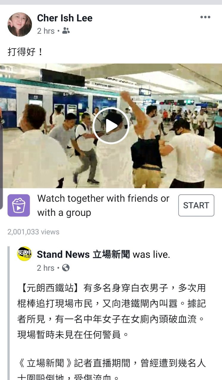 李嘉儀係一名親中派及恐佈份子支持者,佢曾經係Facebook發表支持元朗恐佈份子嘅言論,見下圖: