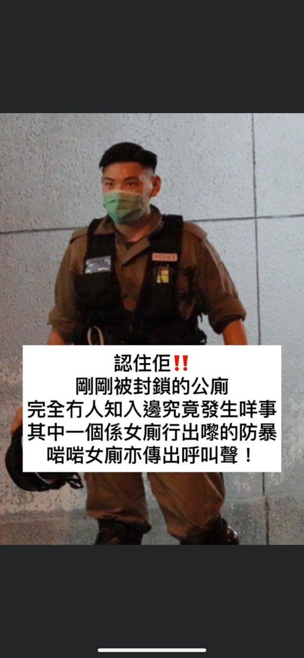 佢曾經係2020-05-11旺角示威中,走入洗衣街女廁內,向一名正在如廁嘅女記者噴射胡椒噴霧及施襲,令嗰名女記者頭部重創,以下係佢出現係現場嘅圖片: