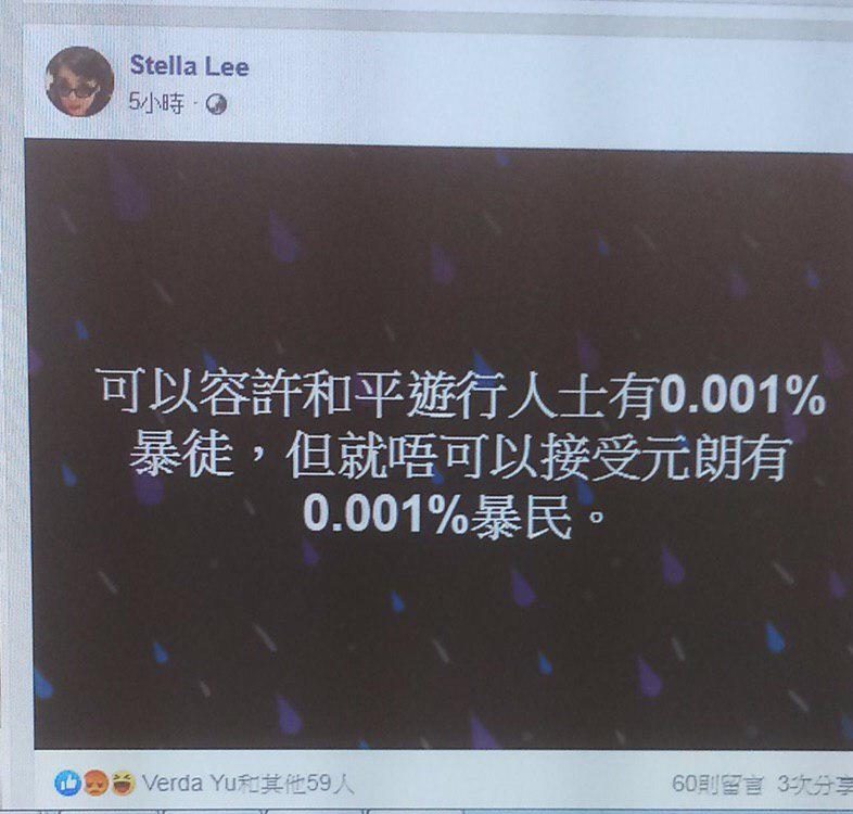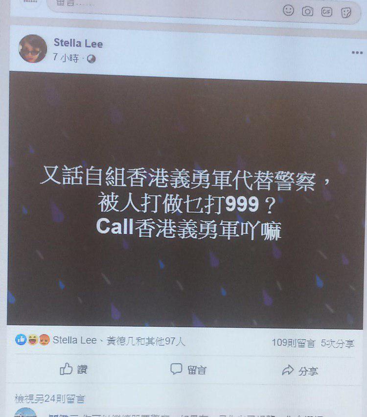 佢曾經係Facebook發表支持香港警察濫捕濫權嘅言論。