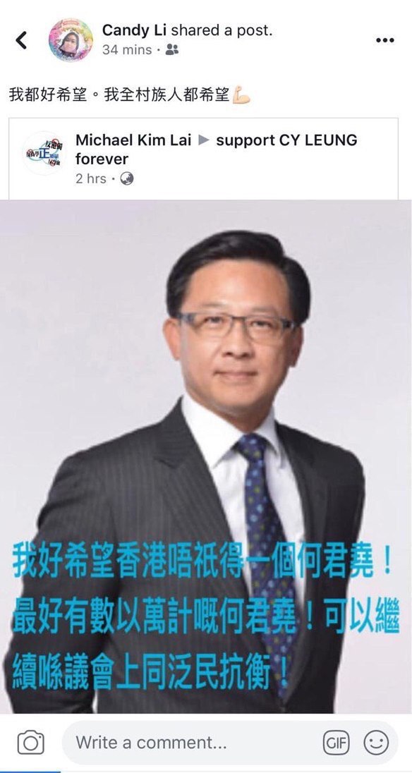她亦曾在Facebook發表親中言論,詳見下圖: