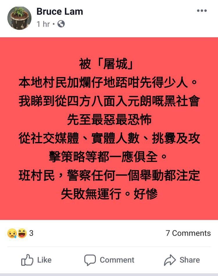 洪漢成係一名撐警藍絲,支持香港警察濫權濫捕並為此歡呼。佢曾經聯同黑社會成員,係元朗舉辦支持香港政府及香港警察嘅活動,詳見下圖:根據讀者資料,佢早係2014年已經有份利用黑社會成員襲擊抗爭者。
